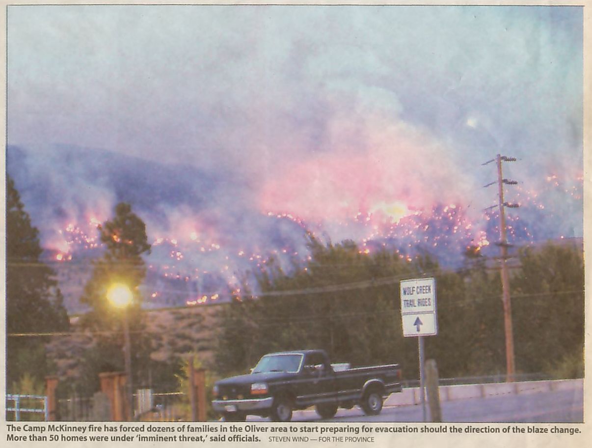 I could see the smoke on my way home from work, and as I pulled into town I could see how bad it really was. I immediately drove home grabbed my camera, climbed onto my motorcycle and headed out for a closer look. I took several shots from various locations along Black Sage Road and Tuc-ul-nuit Drive (keeping out of the way of emergency vehicles), then returned home to check them out. Out of all the pictures I had taken, there were a few that I thought were quite good, so I sent them off to a few of the local and provincial papers. One was picked up by the Province newspaper in Vancouver.My first real published photo. Here it is. Click on it to read the entire article (not writen by me) in Adobe PDF format. You will need Acrobat Reader to view it. Also some of the other pics are at the bottom of the page. Just click on them to view a larger image.